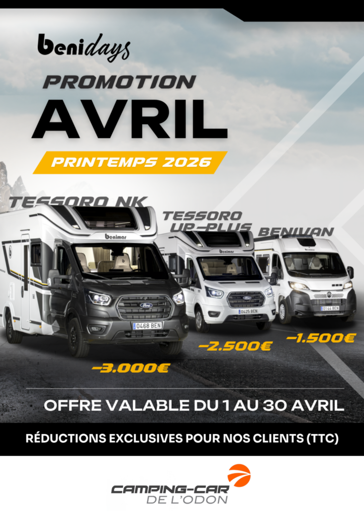 Le printemps est décidément la saison des bonnes affaires. Camping-Car de l’Odon participe aux Benidays, l’opération promotionnelle de la marque Benimar, et vous propose des remises immédiates sur trois modèles neufs tout au long du mois d’avril. Une belle fenêtre d’opportunité pour s’équiper avant les grands départs estivaux.